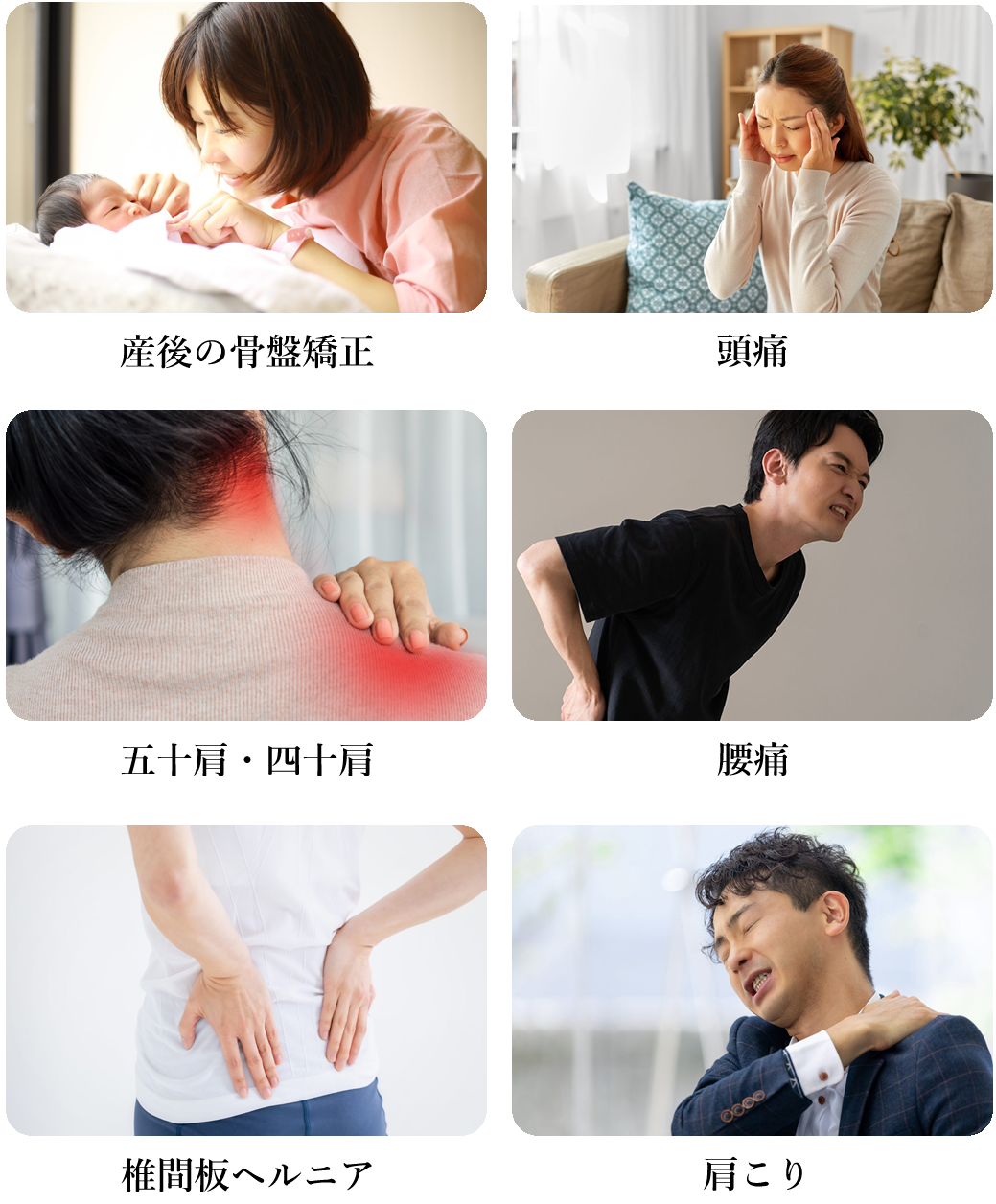 交通事故によるケガ、むちうち症、寝違えや首こりによる首の痛み、肩こり・四十方・五十肩、ギックリ腰・坐骨神経痛・ヘルニア等による腰痛、骨盤のゆがみ・産後の骨盤矯正、頭痛等、不調を根本から改善します。